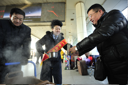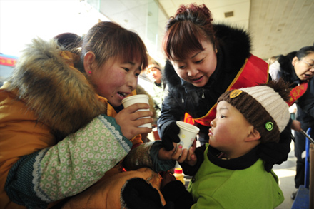 “天太冷了,,,,,,喝杯红糖姜水温暖温暖”。。。。。。。春运时代,,,,,,在总站南区活跃着一支“党员爱心折务队”。。。。。。。他们以售票厅、候车室、收支站通道等要害区域为重点,,,,,,自动为游客送茶倒水、扶老携幼、资助游客提送行李。。。。。。。随着节后天气转冷,,,,,,党员爱心折务队最先天天两次为游客免费派送“红糖姜水”,,,,,,天天累计派送近300斤,,,,,,让候车游客在严寒的冬日感受到车站的温暖效劳,,,,,,老弱病残孕等重点游客更是享受到普遍全程的亲情效劳。。。。。。。